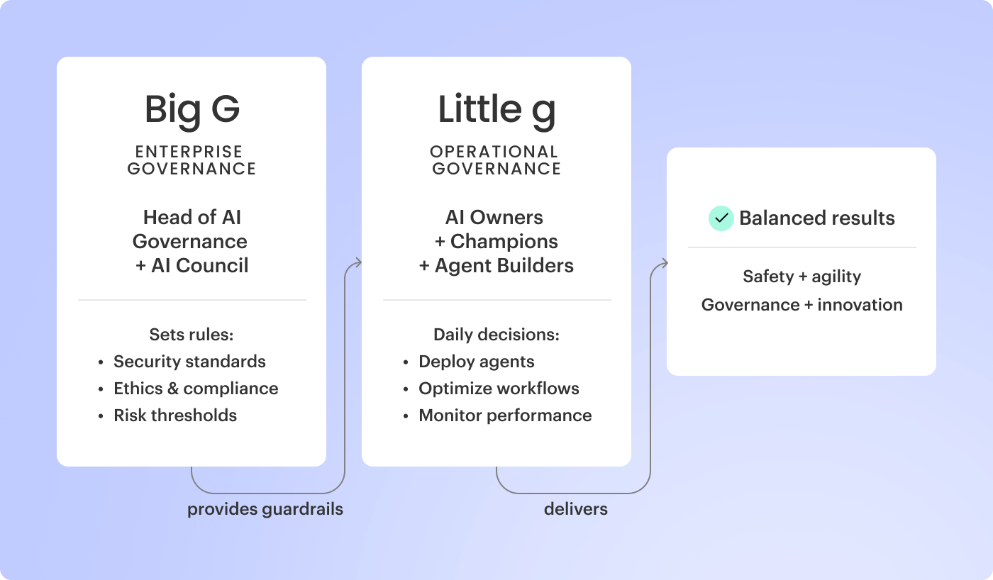 “little g” is where the magic happens. It’s the decentralized, dynamic set of practices that teams use to manage their agents day-to-day. This is where your AI Champions and AI Agent Builders live—embedded directly within business units, not in some separate AI organization.