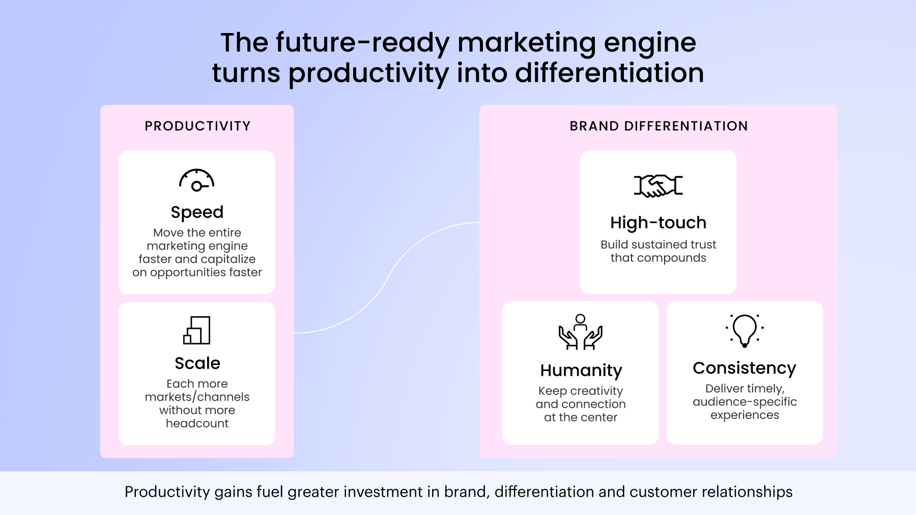 The core insight: Productivity gains from speed and scale create capacity. That capacity gets deliberately reinvested into the differentiation pillars — humanity, high-touch engagement, and consistency.
