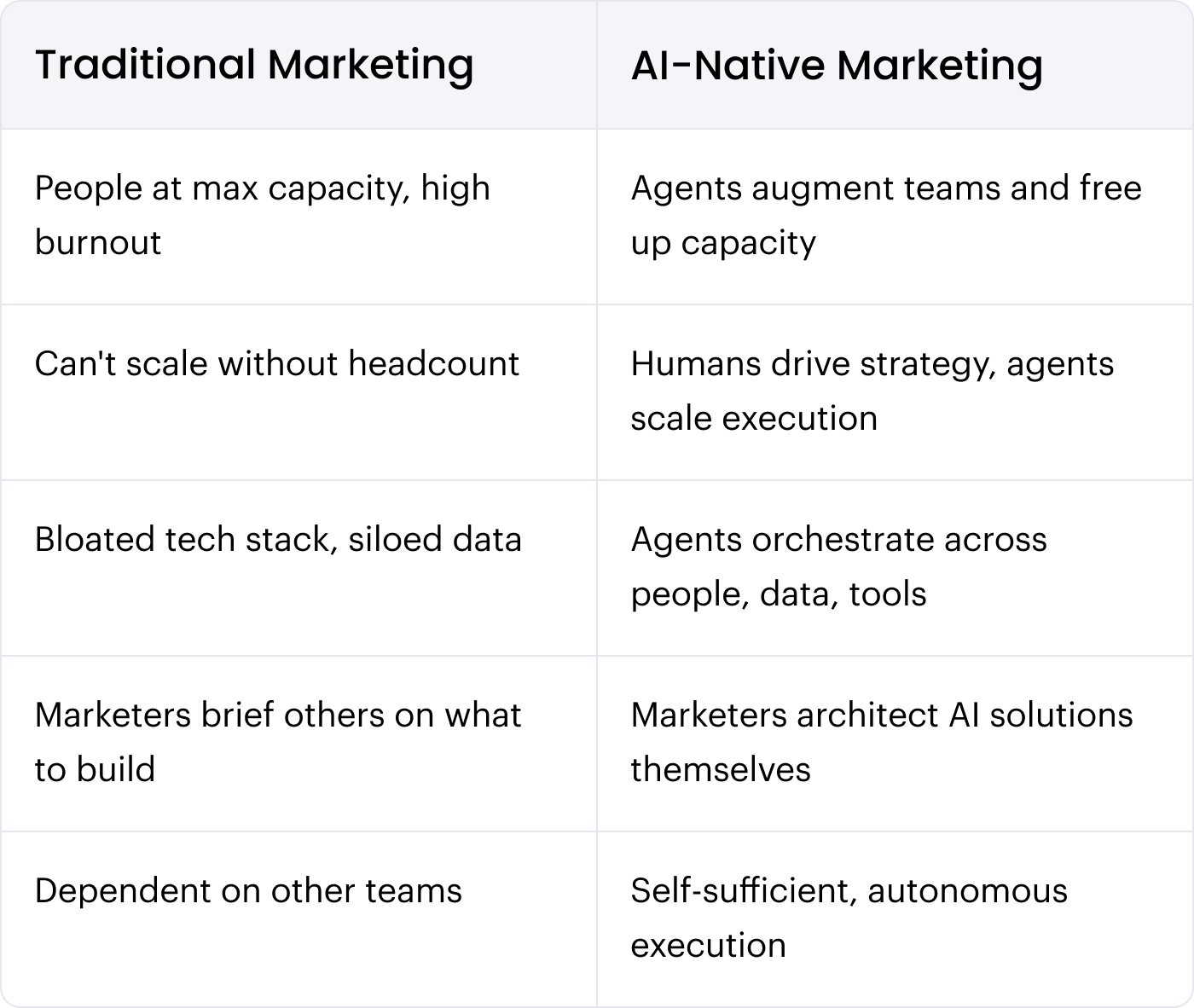AI-native marketing means rewiring your entire operating model, not just adding tools to your stack. It’s the difference between using AI to do your current job faster and redesigning how marketing work fundamentally gets done.