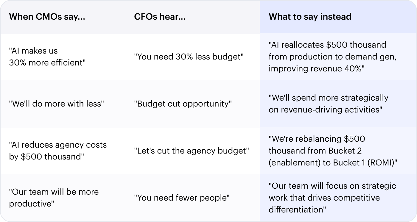 Here’s the disconnect: CMOs measure campaign performance, brand lift, and pipeline influence. CFOs measure returns, payback periods, and cost efficiency. We’re speaking different languages, and “we’ll do the same work cheaper” isn’t a translation — it’s a capitulation.
