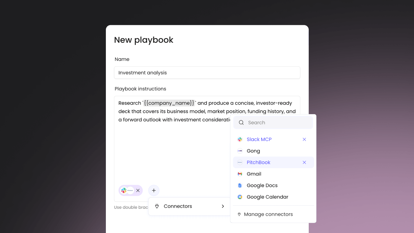 Playbooks change this paradigm entirely. They turn recurring tasks and processes into natural-language templates that alow you to repeat and scale work across teams. Purpose-built for business teams, playbooks are: