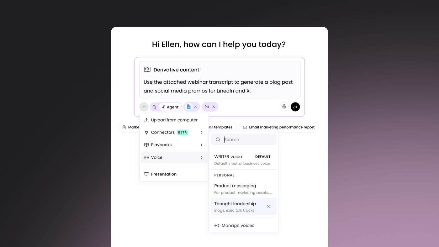 With personality profiles, WRITER Agent allows you to create and select voice profiles that carry through every type of output generated – from research briefs and competitive analyses to sales collateral, customer communications, and all forms of content – ensuring every output sounds like you, not a generic AI.