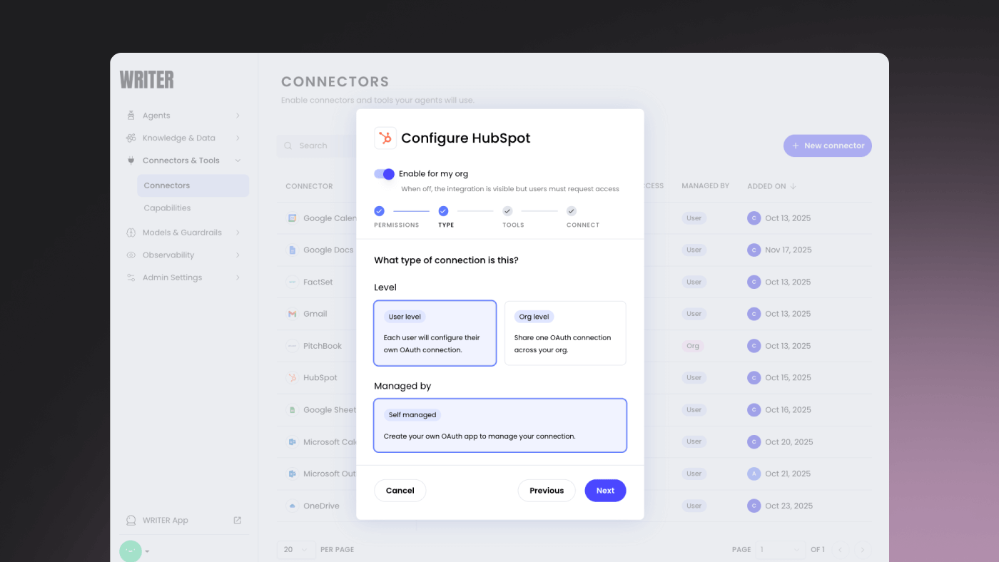 A lack of access to enterprise context is what prevents most AI agents from actually driving value. Connectors, available today in open beta, access the tools, data, and systems your teams use every day, allowing WRITER Agent to go beyond just assisting with tasks to acting as a true operator within your ecosystem. We built these pre-configured, governed integrations on our own Model Context Protocol (MCP) gateway, developed in partnership with leaders like Snowflake, Microsoft, Hubspot, and Google, connectors are the foundation of true agentic orchestration.