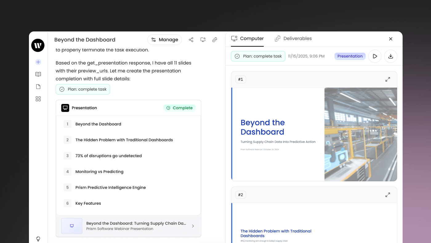 WRITER Agent’s presentation generator changes the equation. From board materials and sales decks to research summaries and strategy presentations, WRITER Agent handles the heavy lifting – structuring the narrative, integrating your enterprise context, producing charts and visuals, and infusing your brand – so that teams can go from idea to presentation-ready in minutes.