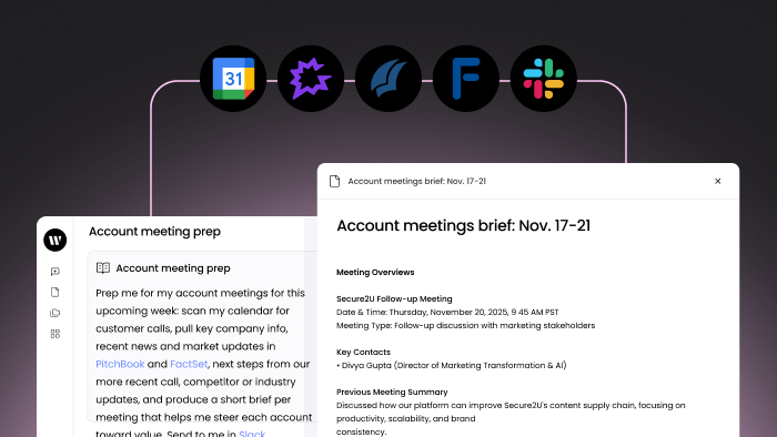 WRITER Agent scans your upcoming calendar events through Google Calendar, pulls company and market context from sources like Gong, PitchBook, or FactSet, and surfaces recent activity from Slack to assemble clear, actionable briefs for each meeting.