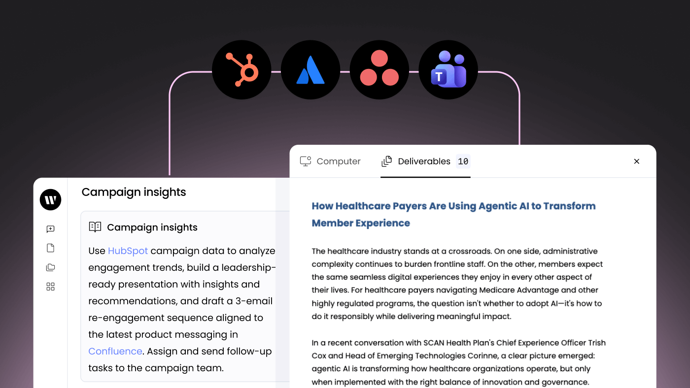WRITER Agent retrieves campaign performance from HubSpot, analyzes engagement trends, synthesizes insights in a presentation with visualized charts and graphs, uses latest product information sitting in docs on platforms like Confluence or SharePoint to write new campaign emails, then assigns follow up tasks and notifies relevant teams in project management and communication tools like Asana and Microsoft Teams