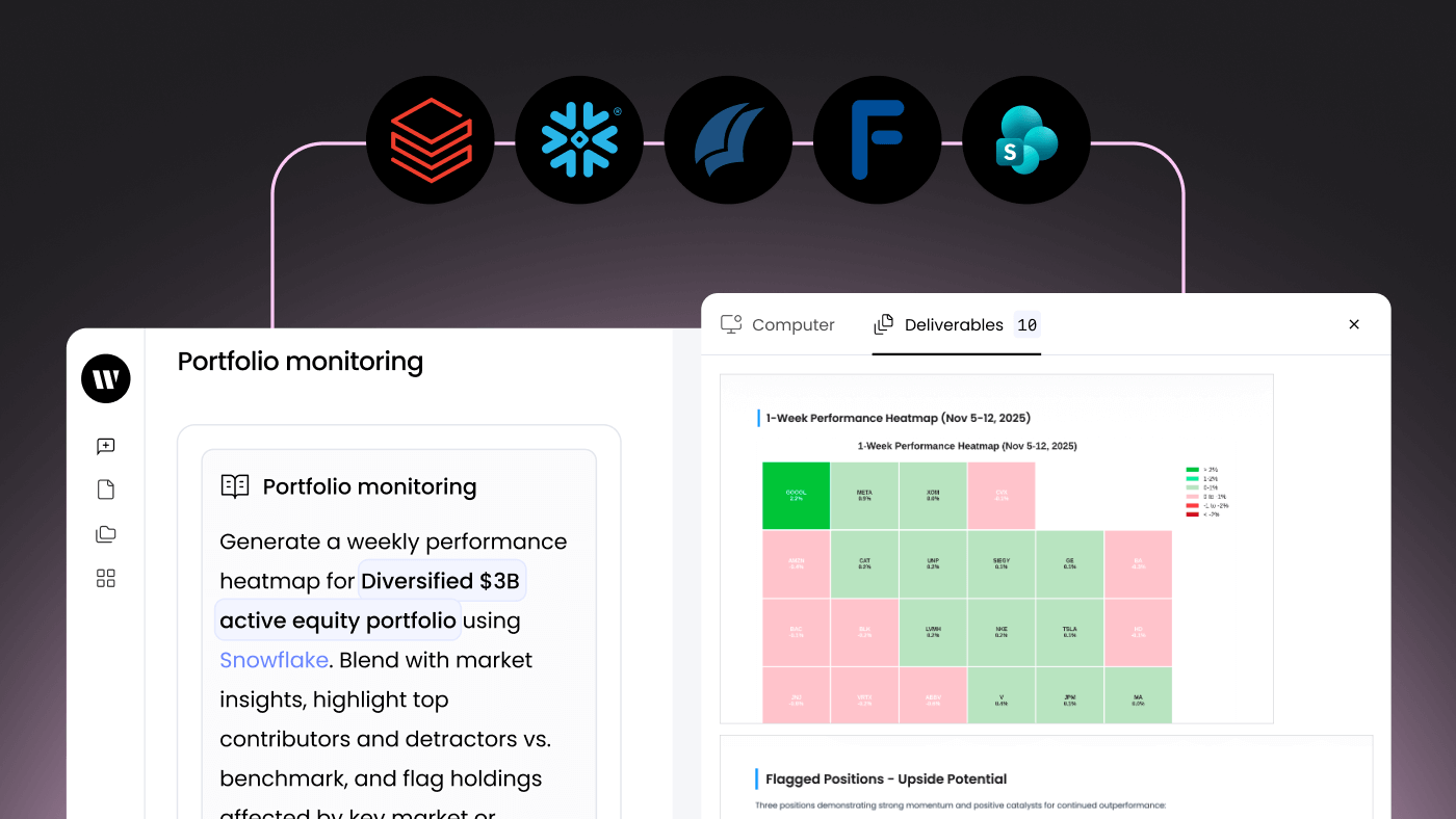 WRITER Agent draws performance and holdings data from Snowflake or Databricks, enriches it with public and private market signals from FactSet and PitchBook, and produces heatmaps and risk alerts saved back into SharePoint. The same workflow can extend into Slack or Confluence when PMs want automated updates or research notes.