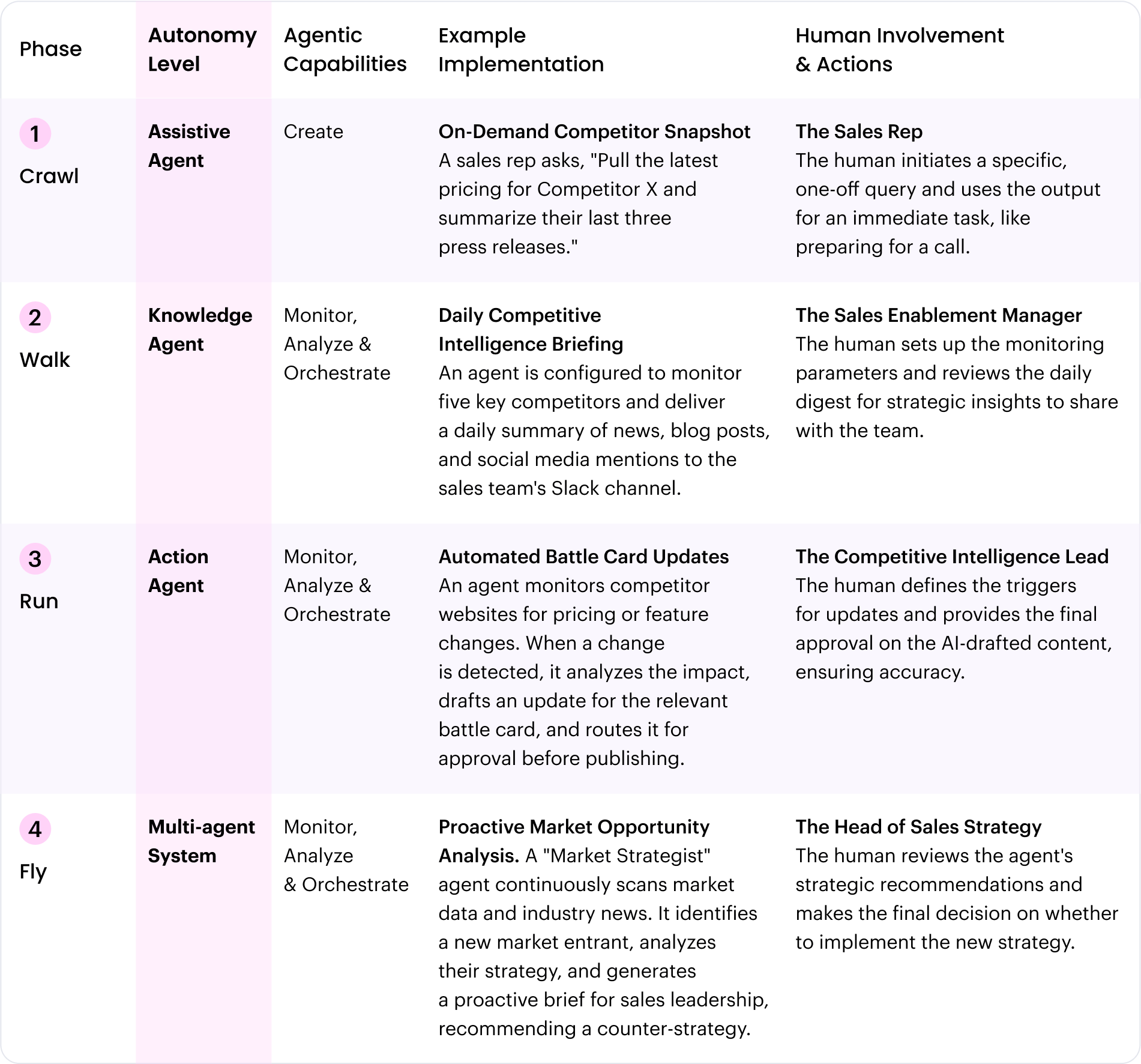 - Fly (The Vision): The Future Vision is a proactive Multi-agent System. This would involve an agent that continuously monitors market news and competitor updates, automatically generating and distributing intelligence briefings to the sales team. The human role is elevated to “Intelligence Consumer,” acting on curated insights without manual effort.