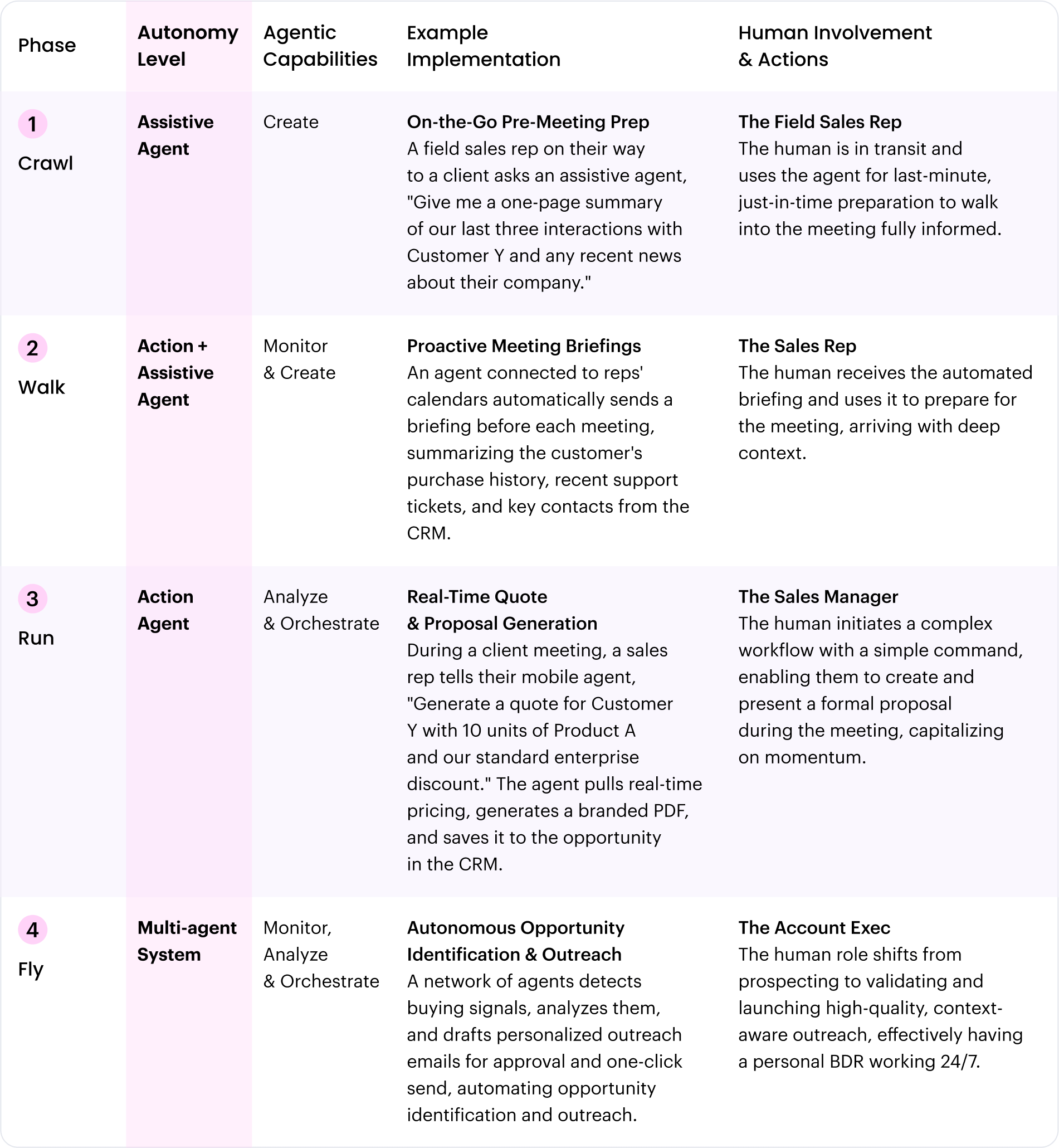 Here are three key sales use cases mapped to the Crawl, Walk, Run, Fly framework.