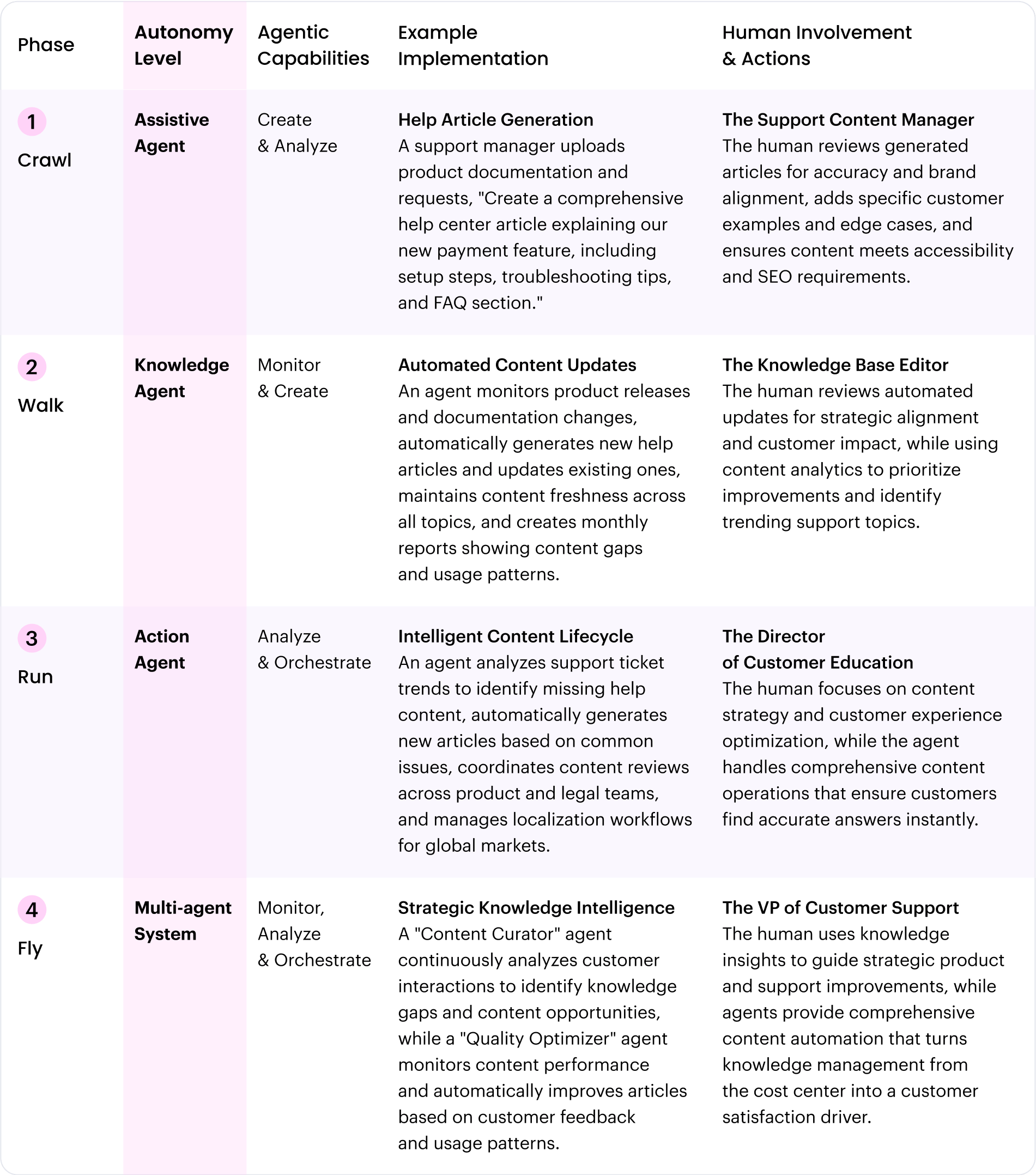 - Walk: Uber implemented a Knowledge Agent that monitored successful ticket resolutions and created complete, ready-to-use drafts of saved replies and articles. The Support Content Team, acting as the “Reviewer,” shifted their focus to strategic alignment and final approval.