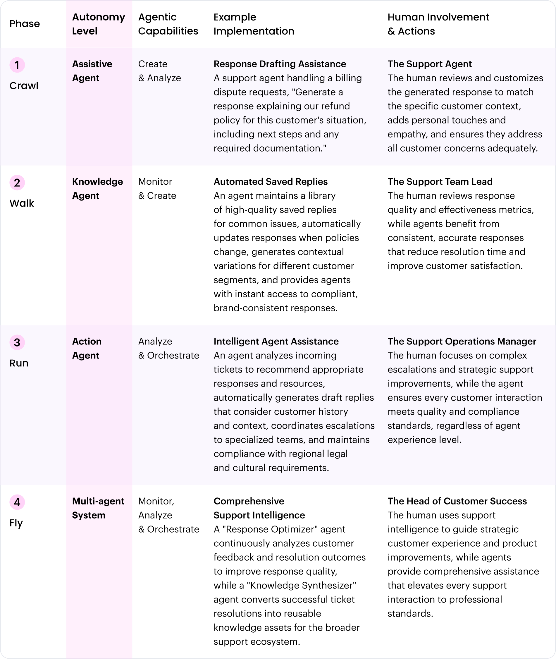- Crawl: The process could have started with an Assistive Agent that simply suggested relevant phrases or sentences from a knowledge base. A support agent, acting as the “Assembler,” would have manually pieced together the final response.