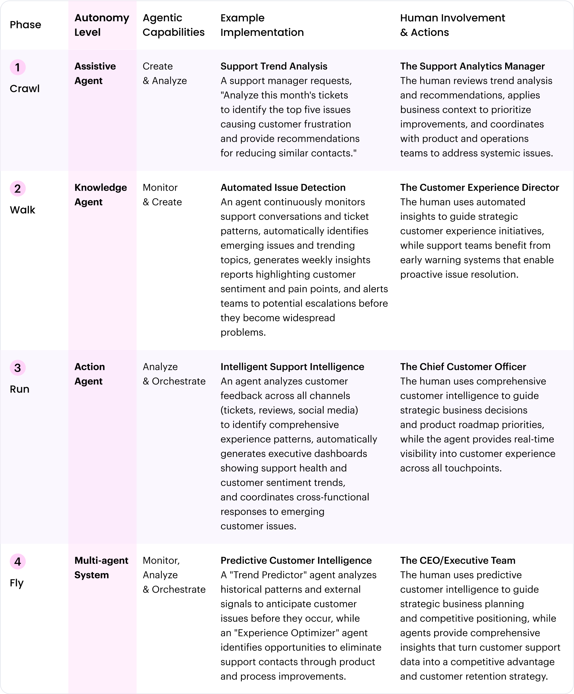 Here are three key support use cases mapped to the Crawl, Walk, Run, Fly framework.