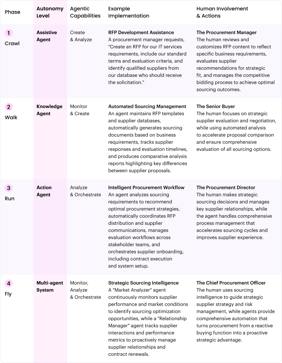 - Run: The next step in automation involves an Action Agent that can orchestrate a complex workflow, like assembling a first-draft RFP response. The human becomes an “RFP Strategist,” initiating the process and reviewing the agent-generated draft for strategic alignment.