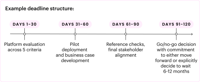 Without a deadline, evaluation continues indefinitely. Set a firm date for platform selection—typically 90-120 days from evaluation start.