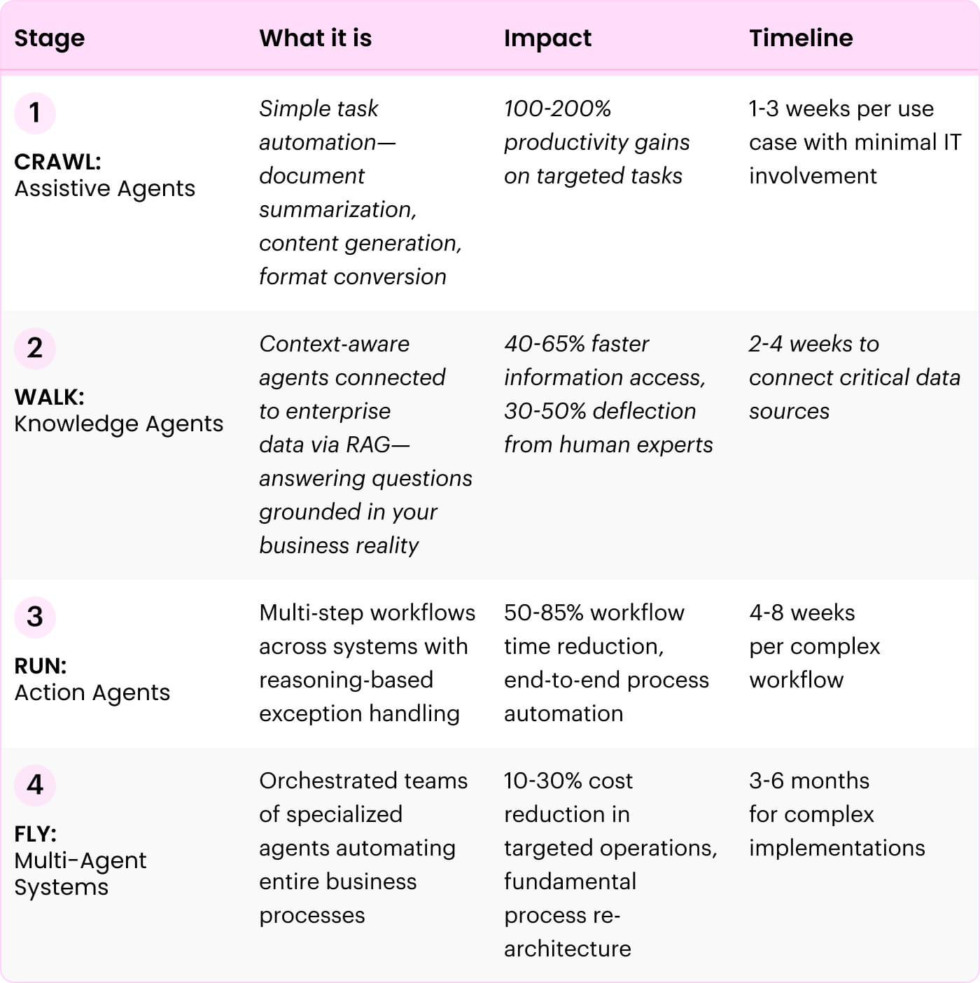 - Intelligent cost reduction: Agents taking full ownership of entire processes, fundamentally re-architecting your cost structures across operations, IT, and the business