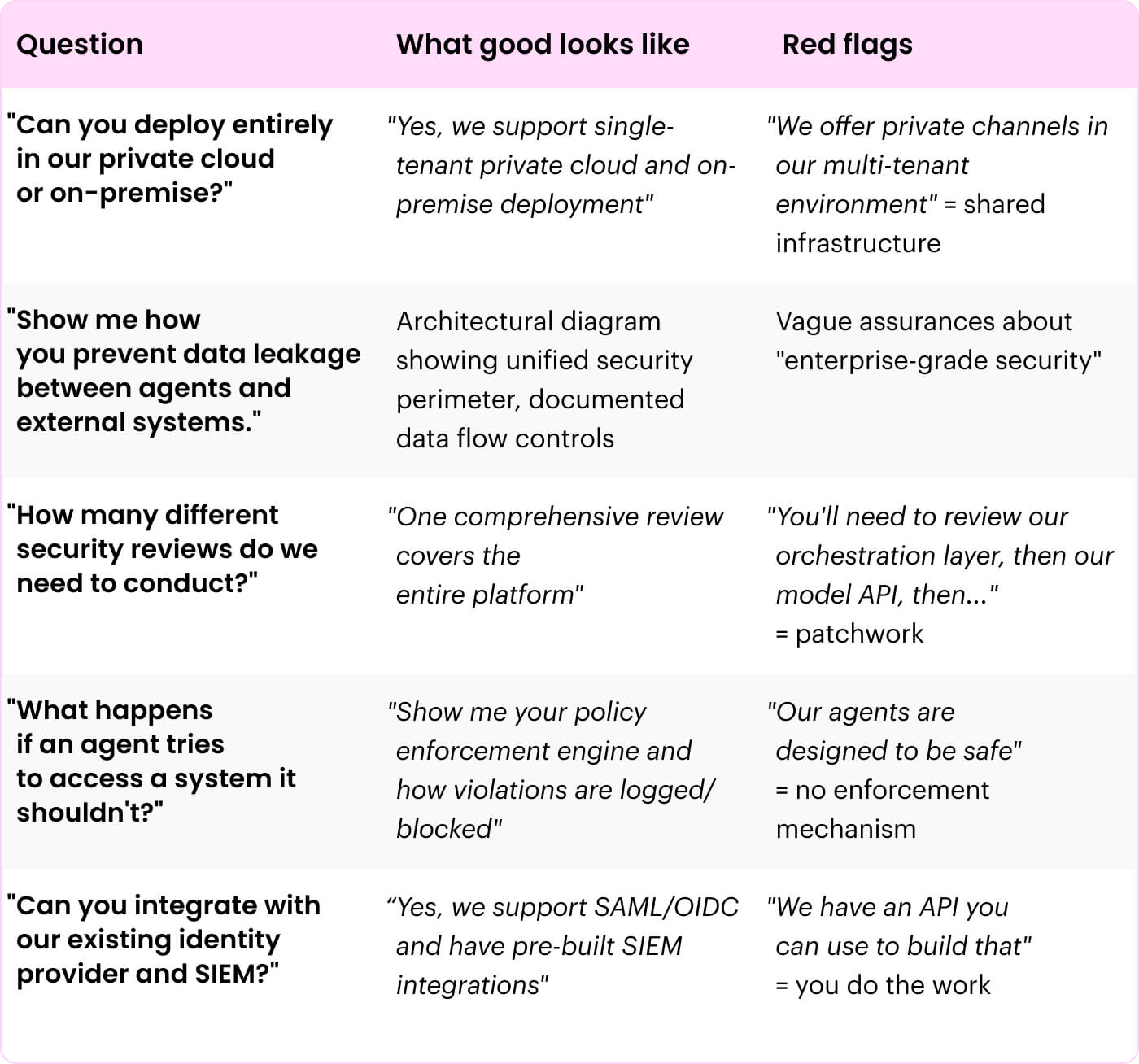 Most agentic AI platforms evolved from consumer products or developer tools. Security and compliance get bolted on after core architecture decisions are locked in. You end up with different security models for different components — the exact fragmentation you’re trying to prevent.