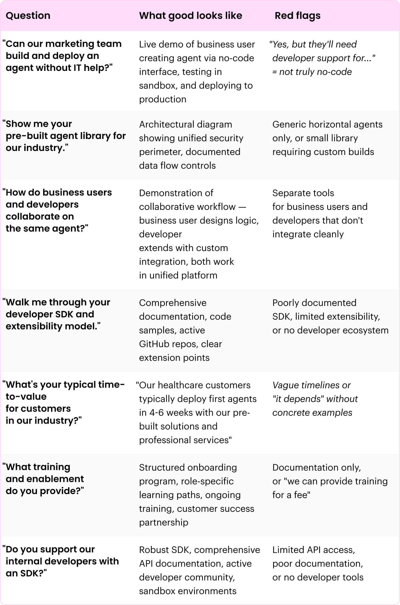 The evaluation paradox: Most enterprise software evaluations follow a familiar pattern—create requirements, demo solutions, check boxes, pick a winner. But agentic AI platforms don’t fit this model. You’re not buying software that does a specific thing. You’re choosing the architectural foundation for how your business will operate for the next decade.