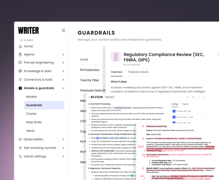 Navigate regulatory complexity with confidence. WRITER delivers financial-specific Palmyra Fin LLM, built-in compliance guardrails, and zero data retention policies. Choose flexible deployment options to meet regulatory requirements.