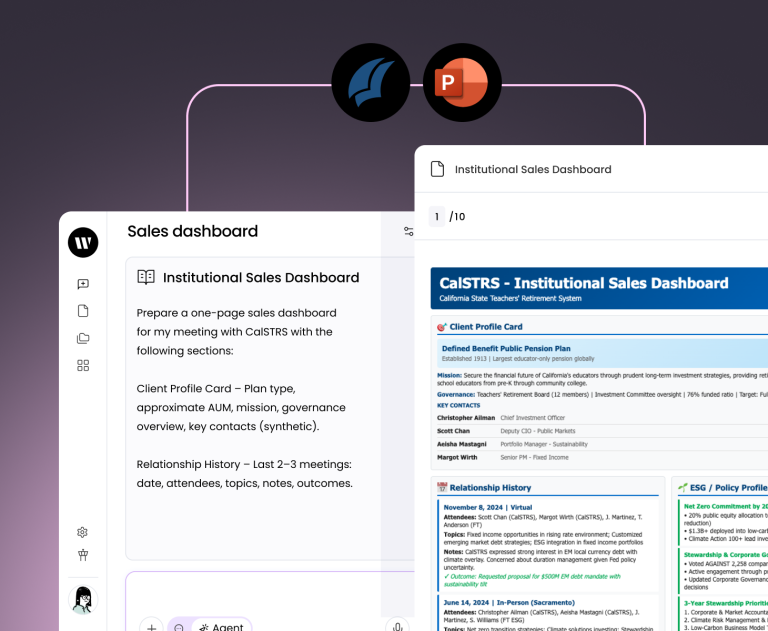 Create dynamic sales dashboards and research packages for every interaction—portfolio analysis, relationship history, and client-ready presentations.
