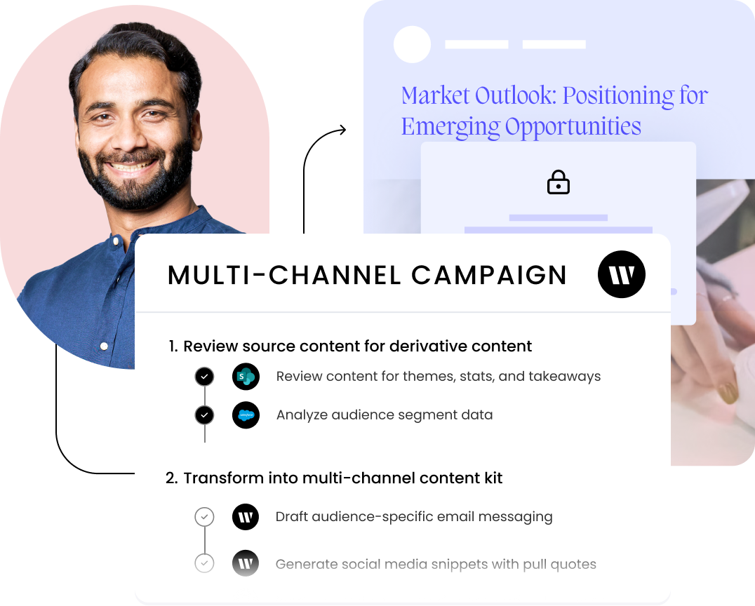 Coordinate parallel creation of on-brand content, derivatives, email, paid media, landing pages, and sales materials.
